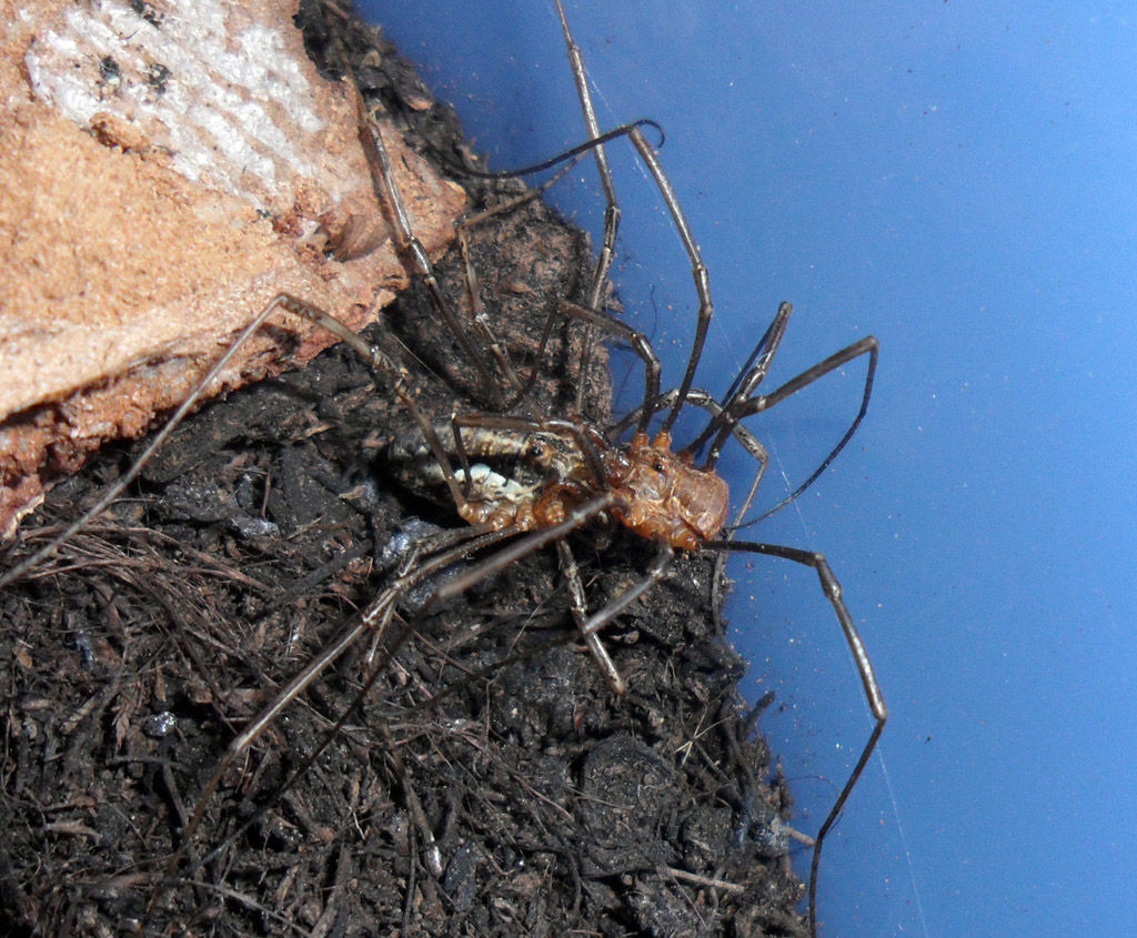 Oggi ho assistito a un accoppiamento  Purtroppo quando ho avvicinato la macchina fotografica si sono spaventati e si sono separati, spero di assistere ad altri e riuscire a fotografarli. Intanto vi spiego la sequenza Appena aperto il terrario ho notato che i due esemplari marroni più piccoli si aggredivano, quindi ne ho tolto uno e messo in una scatoletta separata. Mentre toglievo i resti della falena usata come pasto ho notato che l'esemplare più grande e quello più piccolo erano attaccati, inizialmente temevo che uno dei due stesse mangiando l'altro, poi ho notato che dal ventre dell'esemplare più piccolo usciva una protuberanza gelatinosa che si andava ad unire all'esemplare grande  Ora aspetto la deposizione e spero nelle nascite. Il secondo esemplare maschio ora l'ho messo in un provetta con etere e appena muore lo sposto in alcool in modo da poterlo studiare con cura