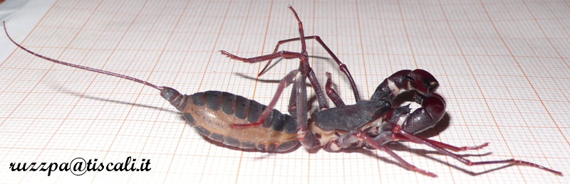 Anche se si vede poco, è fotografato su un foglio di carta millimetrata, du cui si evince che il solo corpo senza telson (il prolungamento filiforme dell'addome) è di circa 4 cm. Ovviamente se consideriamo il telson e gli arti, le dimensioni aumentano di parecchio.