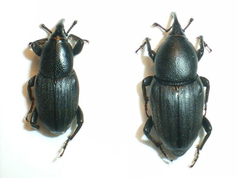 Se non si vedono distintamente squame nei punti della parte dorsale delle elitre, S. piceus (Pallas 1776) per la specie di sinistra è la determinazione più probabile. Confermerei anche S. abbreviatus (Fabricius 1787) per l'esemplare di destra.