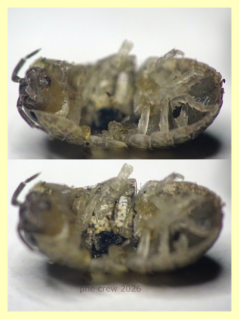 ....proprio oggi, dal momento della cattura, son passati esattamente 113 giorni. Fin ora si e' alimentato con i sementi gia' citati sopra, ma stamani ho voluto provare a dargli un qualcosa di diverso......un Porcellino di terra ! Appena ucciso, dunque fresco, glielo poggio non molto lontano e camminando lo sfiora.... prima lo addenta assaggiandogli una zampa poi si fionda con le fauci nel ventre smangiucchiandolo. Non sono sicuro che se lo stesse proprio mangiando, credo piu' che stesse suggendo i suoi liquidi, perche' era tre giorni che non gli davo da bere e poi perche' un essere con quelle fauci avrebbe causato danni maggiori alla vittima....invece quasi nulla (guardate l' ultima foto cio' che rimane dopo 1 ora e 20 di smangiucchiamento). Dunque ora i miei dubbi sulla specie sono aumentati credendo che la sua dieta fosse del tutto basata su semi e grani. :?