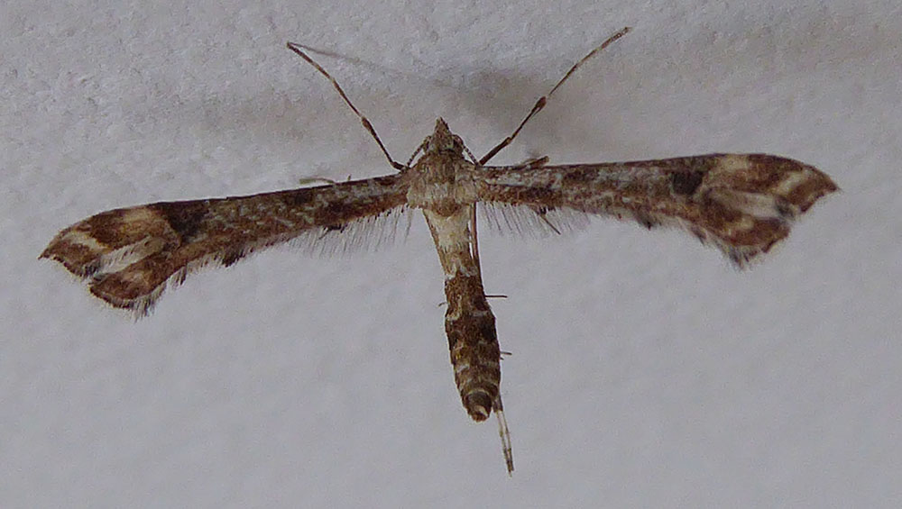 Buongiorno! Appena fotografata in salotto; è piccola, fa 1,5 cm di apertura alare. Direi che è una pteroforide, ma oltre non riesco ad andare. Qualcuno ce la fa?