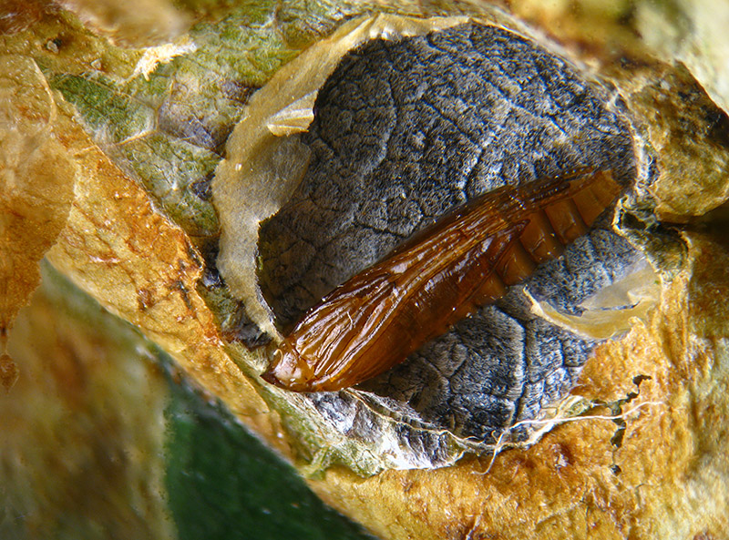 lacerata l'epidermide fogliare le immagini di un bozzolo con la crisalide; il c.i. misura mm 7x5: