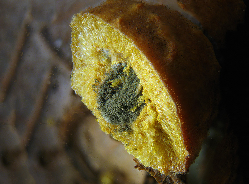 Ho poi sezionato le galle rimanenti; una era completamente vuota pur presentando la cavità che avrebbe potuto ospitare un Insetto. Una conteneva una muffa di colore verde: