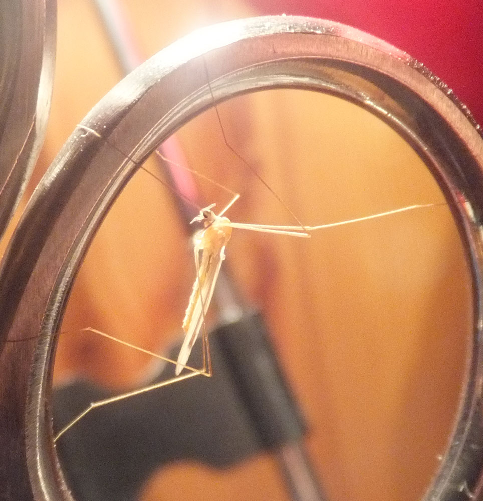 Qualcuno ha idea di cosa sia? Sembra una grossa zanzara (ma non grande come una tipula, una mezza via, diciamo), di colore giallino o marroncino, più scuro e tendente all'arancio sul torace-schiena.