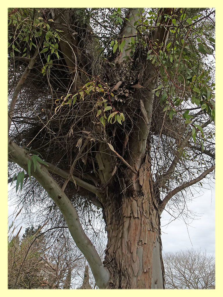 ...questo e' invece l' Eucalipto dove sotto corteccia ho trovato l' esemplare. Ho scandagliato il tronco e non ho trovato incavi pieni d' acqua. Ma sulla chioma c'e' tutto un groviglio di rami secchi e foglie....e' possibile che sulle foglie piu' compattate si sia formata qualche pozzanghera d' acqua ?....mah e' solo un ipotesi....