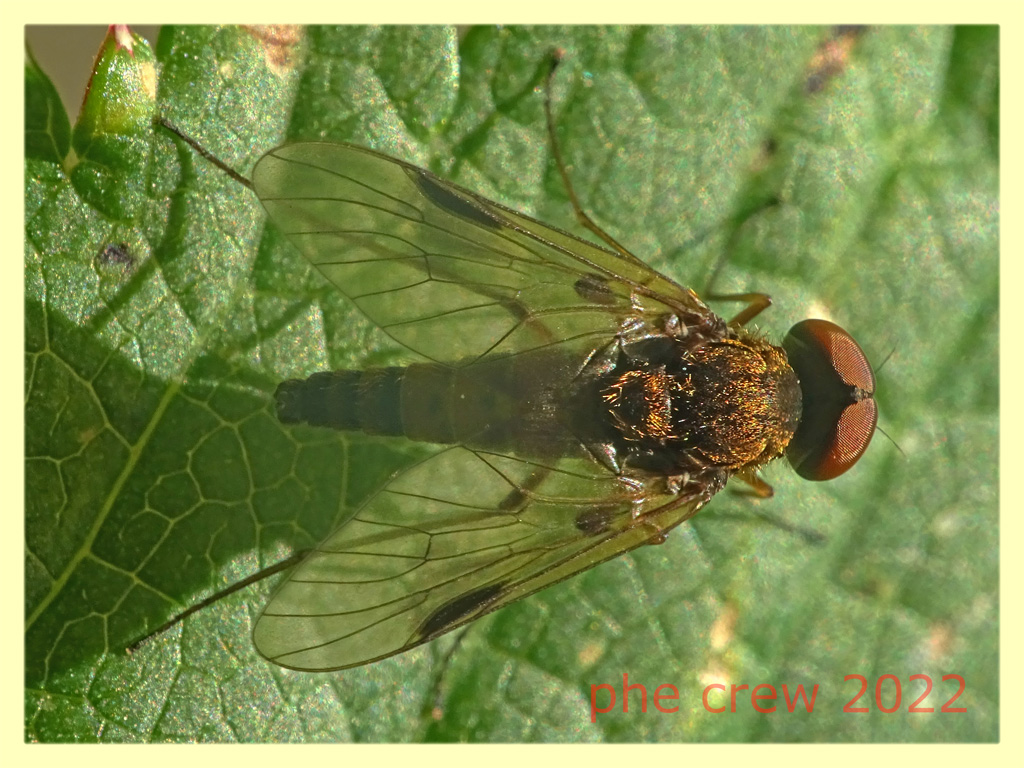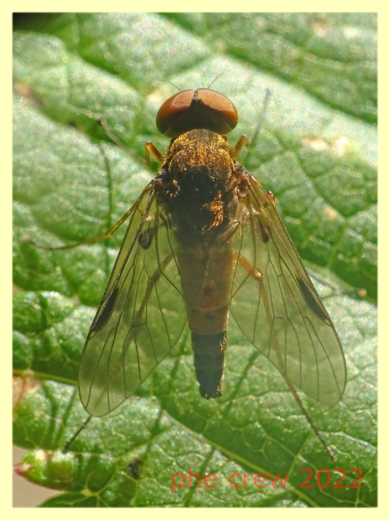 Con le chiavi di Van Veen al primo tentativo sono arrivato a C. aureus, lì usato al posto di C. asiliformis che è l'attuale nome valido. Solo che con l'aspetto non ci siamo affatto; qualcosa non ha funzionato. In effetti guardando attentamente una vaga ombreggiatura sull'ala sotto lo pterostigma si può indovinare, cosa che aprirebbe l'altro ramo delle chiavi che porta a Chrysopilus luteolus (Fallen, 1814). Chissa poi quanto sono attendibili le chiavi di Van Veen per la nostra fauna.