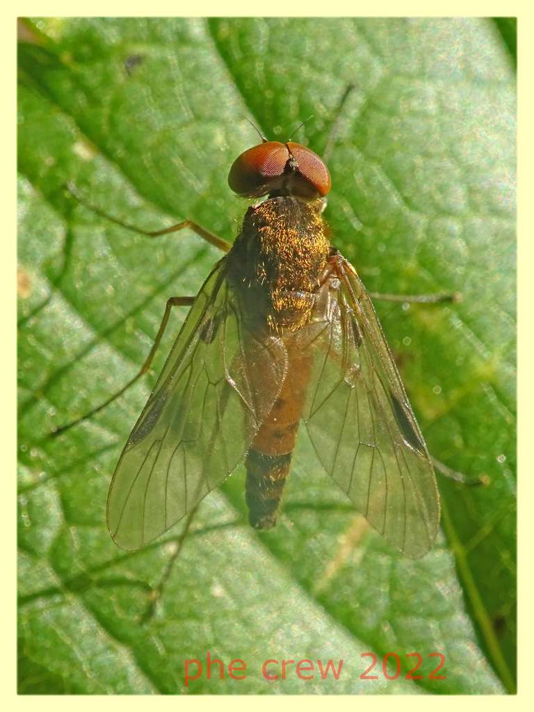 Con le chiavi di Van Veen al primo tentativo sono arrivato a C. aureus, lì usato al posto di C. asiliformis che è l'attuale nome valido. Solo che con l'aspetto non ci siamo affatto; qualcosa non ha funzionato. In effetti guardando attentamente una vaga ombreggiatura sull'ala sotto lo pterostigma si può indovinare, cosa che aprirebbe l'altro ramo delle chiavi che porta a Chrysopilus luteolus (Fallen, 1814). Chissa poi quanto sono attendibili le chiavi di Van Veen per la nostra fauna.