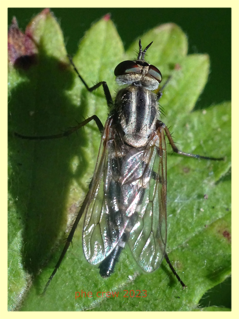 ...purtroppo brutte foto, ma penso che si possa determinare come Thereva valida femmina da questi dettagli: tutti i segmenti antennali di egual spessore faccia pelosa occhi separati con callo nero lucente (femmina) callo frontale unico, stretto e lungo tutt' al piu' con una piccola rientranza al centro ma mai separato in due calli femori posteriori con setole anteroventrali disposte su una fila femori anteriori senza setole anteroventrali misura dai 9,5 ai 12,5 mm. (ad occhio le misure coincidono) |