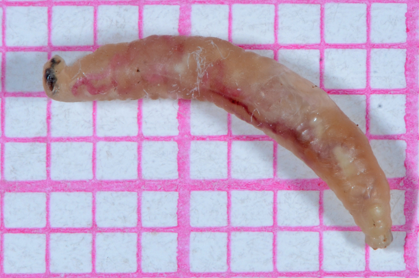 Larva di Dittero Brachicero Ciclorrafo. In una delle due foto della larva si intravvede per trasparenza lo scheletro cefalofaringeo, nerastro, indicativo della sezione Ciclorrafi, e all'estremità caudale si riconoscono i due spiracoli posteriori ben sclerificati. Meno sicuro secondo me, sulla base di queste foto e senza un esame diretto della larva, individuare una famiglia, anche se molte sia per morfologia larvale sia per ambiente di sviluppo si possono escludere.