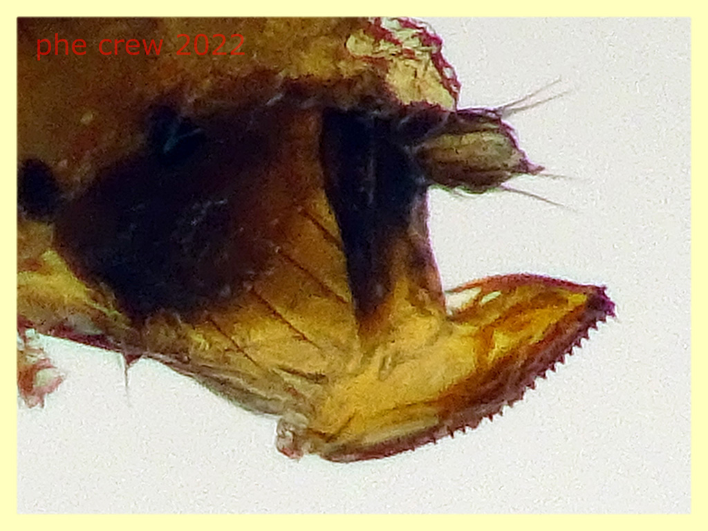 ...il 20.X.2022 ho ritirato delle trappole aeree con mix mela, banana e birra sempre ad Anzio ma in un altro prato;….di queste Drosophila sp. ne ho trovate una 30 ina. Il problema e': dato che c' erano alcuni maschi con spot neri sulle ali nel gruppetto (in foto solo una parte con solo un maschio) mi sono convinto essere tutte D. suzukii….ma poi...mi son detto...non e' che conviva anche con D. melanogaster ? Ho fotografato l' ovopositore dell' unica femmina che era messa meglio e anche l' ala….ma non sono riuscito a trovare sul web la foto dell' ovopositore della D. melanogaster...dunque non so come e' fatto, questo fotografato sembra proprio della D. suzukii....o no ?