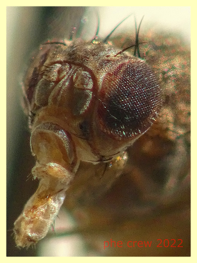 ...dunque ho solo questi dettagli che mi portano al bivio Drosophila repleta / hydei, ...non so dove si trovi esattamente il forecoxae...sicuramente vicino la coxa….e credo che purtroppo in queste foto nemmeno si veda. Il soggetto e' lungo 3,2 mm. ed e' stato trovato in un unico esemplare in mezzo alle Drosophila suzukii in una trappola aerea con mix mela, banana e birra.