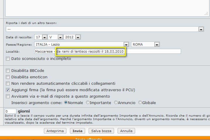 Se invece si conosce o si vuole indicare solo la provincia, ma non la località esatta, oltre ai consigli dati da Vinicio ("dintorni", "25 mm", "dietro casa", etc, etc...) basta anche solo inserire un segno come -, _ oppure . per non lasciare vuoto il campo ed evitare di dover segnare i dati di raccolta come incompleti.