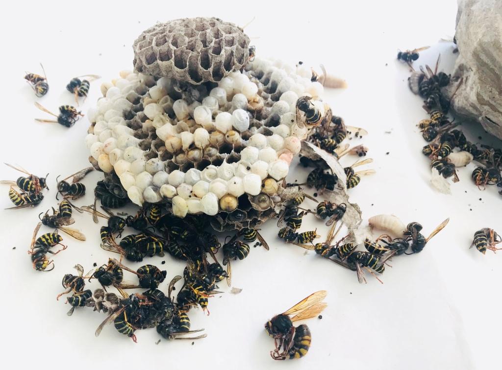 nella foto, un genocidio per aver fatto il "nido" sopra la porta di casa del vicino (Val Masino, Sondrio). Sono 2 ripiani di celle dentro un involucro di legno masticato di circa 12 x 15 cm, gli imenotteri sono lunghi circa 2 cm. Avrei detto calabroni (per via dell'involucro del nido) ma ho una raccolta di calabroni veri (Liguria) lunghi oltre 3 cm e celle grandi il doppio che mi lascia dubbi. Grazie per una cortese risposta! (forum oppure g.bernardi2@virgilio.it).