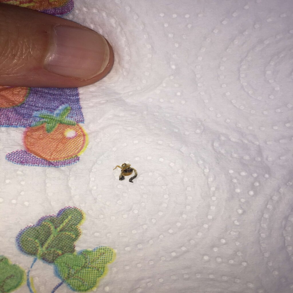Buonasera, ieri stavo sdraiato (su un asciugamano) sotto un albero in un giardino sulle rive del lago di Bolsena quando mi sono sentito questo insetto nel padiglione auricolare. Mi sono dato uno schiaffo e l'ho spiaccicato. Perdonate la qualità delle foto ma è quel che rimane, più vicina non riesco a farla. All'inizio ho pensato fosse una zecca e sono entrato nel panico, lo chiedo apposta. Spero possiate tranquillizzarmi. P.S. sulla testa ha dei puntini neri (due credo siano gli occhi). Poi aveva una sorta di guscio/bozzolo giallognolo della consistenza friabile, tipo quella cosa che rimane sul chicco di mais quando fate i pop corn (si, è oscena la descrizione). Spero possiate aiutarmi con un grande sforzo, grazie.