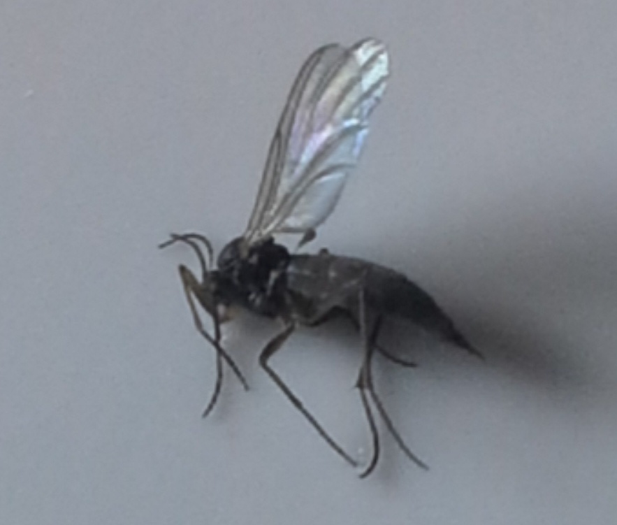 Ciao Michele, l'insetto fotografato mi sembra uno Sciaride (Diptera), forse del genere Bradysia, prova a fare una ricerca in Internet per vedere se può corrispondere con gli esemplari che hai trovato in casa.