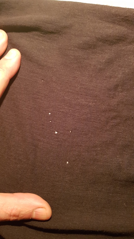 Salve a tutti, come diceva Glaphyrus mi è stata consigliata una fumigazione con termonebbiogeno... ma non so ancora se ho risolto qualcosa o no...... di seguito vi posto i ritrovamenti post disinfestazione e due foto simili alle tante precedentemente postate di questi granellini che però ho ritrovato su indumenti che avevo lavato a 80 gradi e asciugati in asciugatrice e riposto in buste sigillate prima della fumigazione, naturalmente ritrovati addosso, sempre in vicinanza dei fori sul tessuto, a seguito di intenso pizzicore.Per cui per precauzione imbottirò di antitarme simil naftalina le buste con gli indumenti lavati precedentemente alla disinfestazione sperando di non avere altri avvistamenti........ preferivo essermi immaginato tutto... :) :) :)