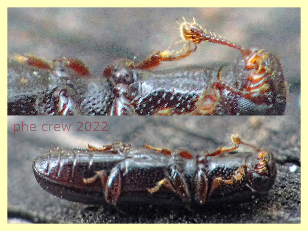 Ricorre l'associazione con varie specie di scolitidi, e d'altra parte la forma cilindrica dell'adulto è perfettissima per aggirarsi nei tunnel larvali di scolitidi (appunto), o altri xilofagi che scavano analoghe gallerie.