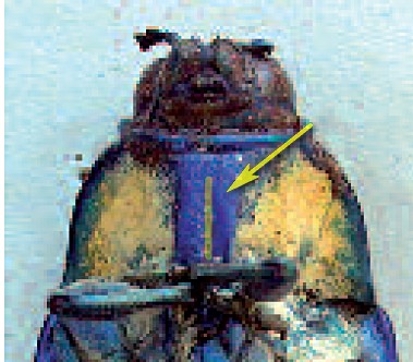 nella posizione indicata invece con "ribordo" c'è invece un solco, una sorta di grondaia (appunto la "doccia"), che percorre il margine laterale del pronoto, delimitata verso l'esterno da un bordo rialzato che può presentarsi assottigliato a spigolo, e quindi non nettamente delimitato rispetto alla superficie della doccia, oppure distintamente ispessito e discontinuo rispetto a ciò che sta all'interno (immaginate qualcosa di simile a uno spigolo su cui avete infilato un tubo di plastica tagliato per il lungo), e questo ispessimento, delimitato da una sottile linea, è appunto il "ribordo"