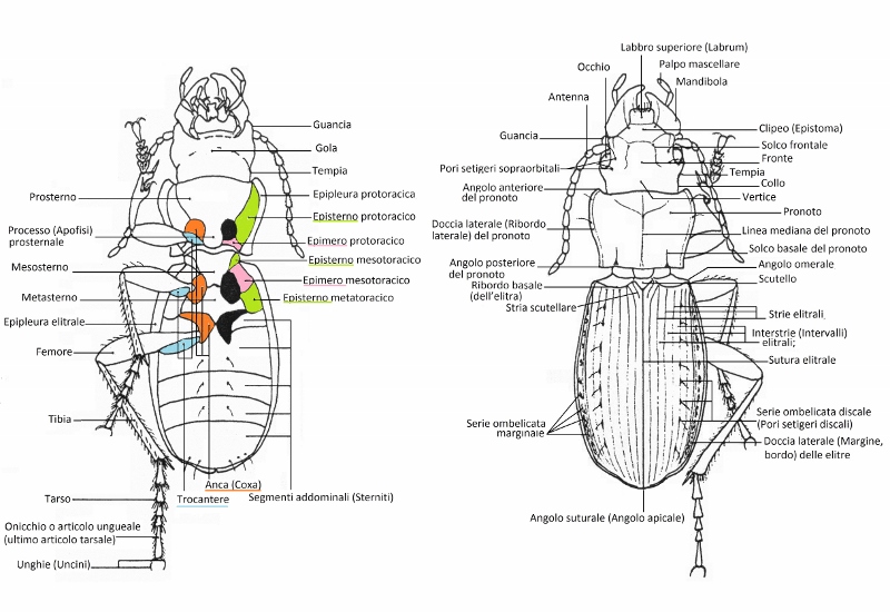 Impieghiamo una immagine dell'amico Carlo Pesarini (ho sostituito i numerini con le definizioni) che spiega piuttosto bene, secondo me, la morfologia esterna di un carabide: