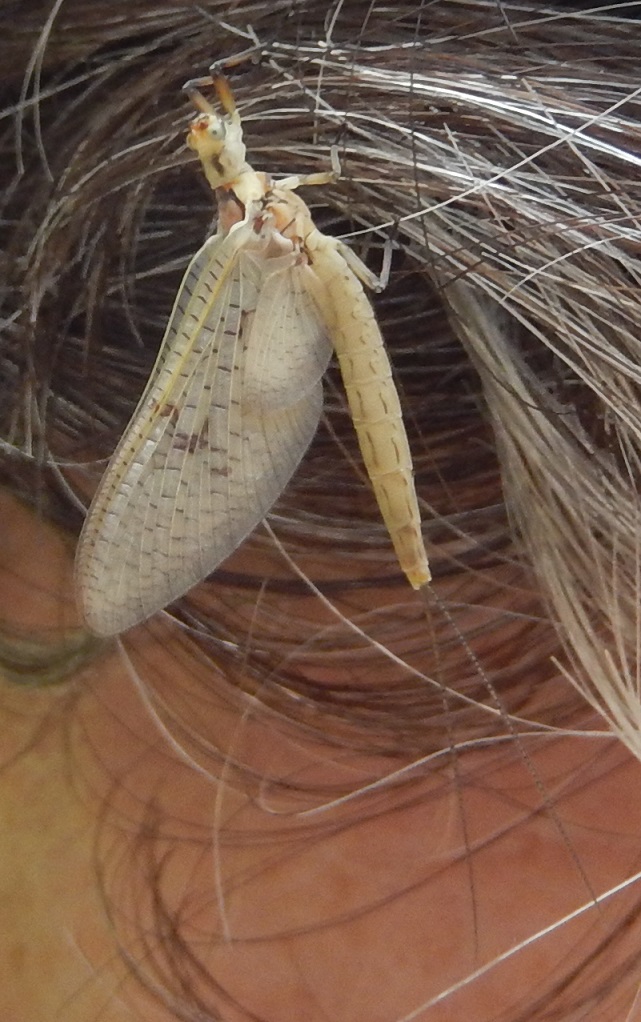fotografato tra i capelli di... una gentile ospite umana. Piccolo, a parte i cerci poteva essere 1,2 cm. Non lontano dal lago. Un efemerottero? Grazie a chi mi può aiutare!