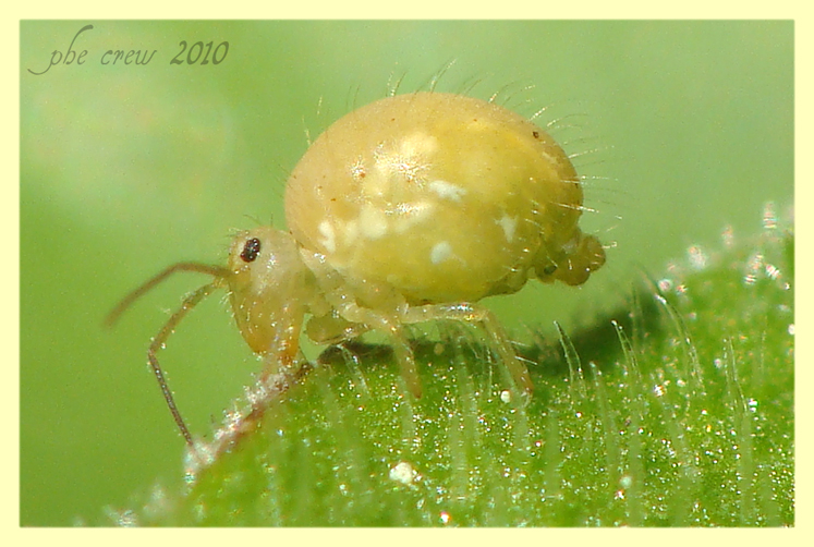 ...questo in foto dovrebbe essere Sminthurus viridis , che (leggendo in internet) provoca ingenti danni all' agricoltura, specialmente sulle foglie, provocando delle piccole e tonde erosioni.