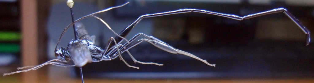 L'unico esemplare in mio possesso è una femmina di Pelecinus polyturator, specie caratterizzata dal corpo completamente nero brillante. E' la specie più diffusa, infatti si può trovare in: Canada, Messico, Guatemala, Honduras, Nicaragua, Costa Rica, Panama, Colombia, Venezuela, Guiana Francese, Ecuador, Perù, Bolivia, Paraguay, Brasile, Uruguay e Argentina.