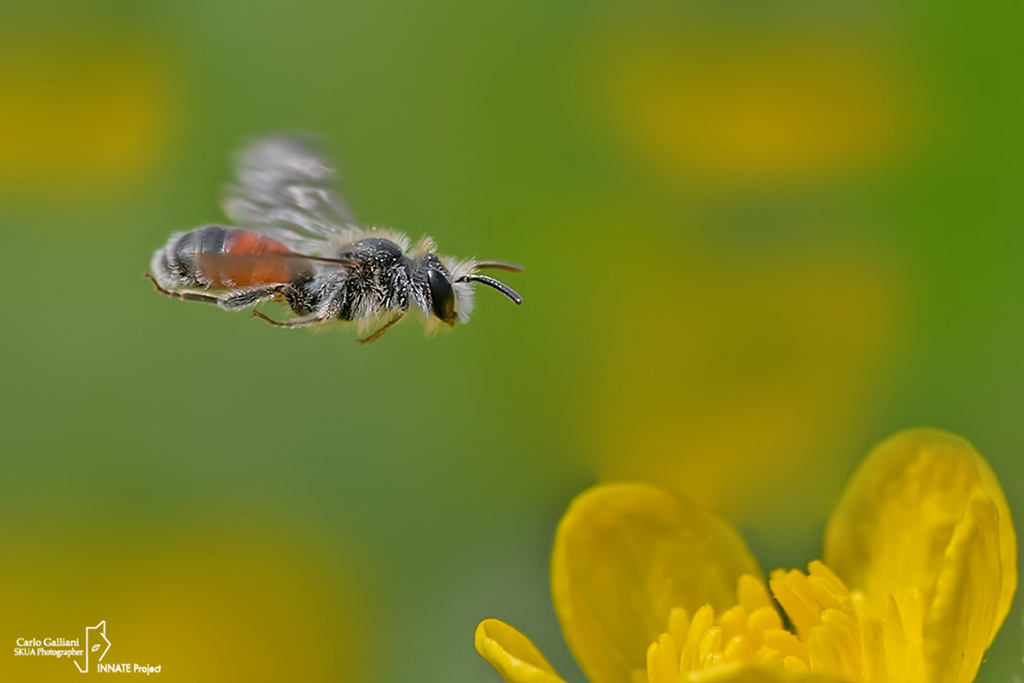 posso confermare che quelle posate avevano del polline sulle zampe mentre quelle in volo erano probabilmente maschi a cerca di femmine perchè arrivavano sempre sui fiori dove c'era un individuo posato e stazionavano per qualche frazione di secondo