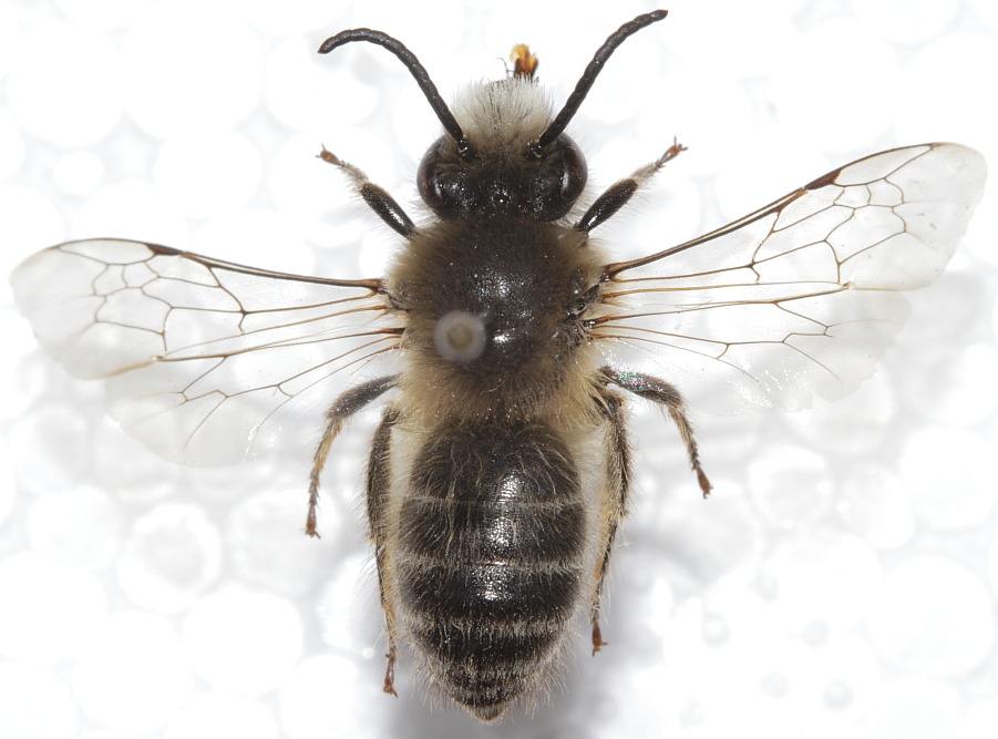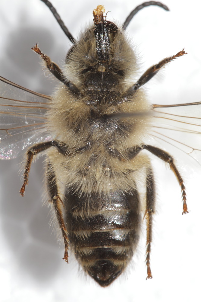 Fovee facciali assenti, nervo basale corto, seconda e terza cella submarginale all'incirca della stessa superficie, nervulus preforcato, secondo nervo ricorrente a forma di S, tergiti con bande chiare apicali: é una femmina di Colletes.