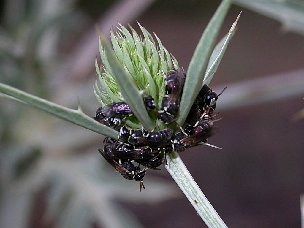 L'osservazione dei fiori al tramonto, in particolare di eringi, cardi e centaurea, lascia spesso modo di osservare cose interessanti. Qui c'è un gruppetto di imenotteri che si prepara per la notte. |