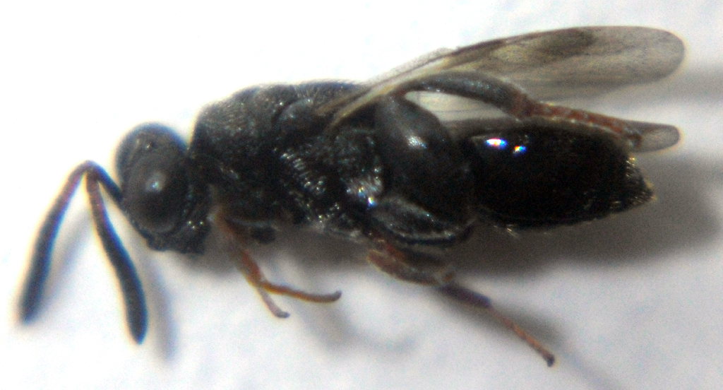 Questo piccolo Chalcidide l'ho raccolto in veranda. Per via delle zampe rossastre e del segmento toracico(non capisco se è lo scutello o il metanoto) prolungato con due denti apicali direi che si tratti di Haltichella rufipes.