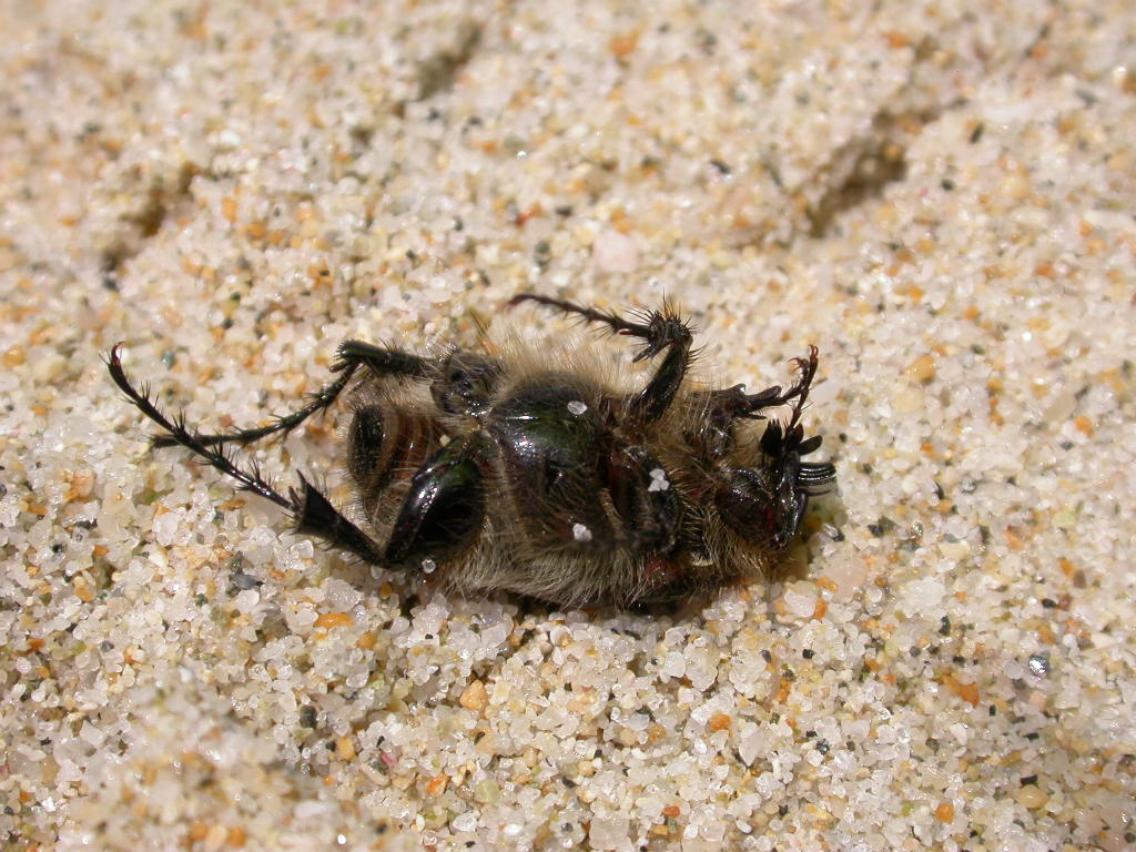 Nella sabbia, morente, un Pachypus sardiniensis e a breve distanza una Capnodis tenebrionis: pur essendo una specie banale è sempre una bella bestia: Dietro la spiaggia sabbiosa, tra gli arbusti, si dipanano diversi sentieri: sono ottimi punti di passaggio per vari imenotteri, tra cui mutillidi e crisidi (che non ho fotografato per questioni di velocità di volo eccessiva…  ): di seguito, un maschio di P. sardiniensis appeso su Calicotome villosa (al crepuscolo saranno più frequenti), un bell’esemplare di Strictoleptura cordigera su fiori di Daucus carota , nella sua elengantissima livrea; un edemeride dal colore purpureo, purtroppo reso male dalla foto: