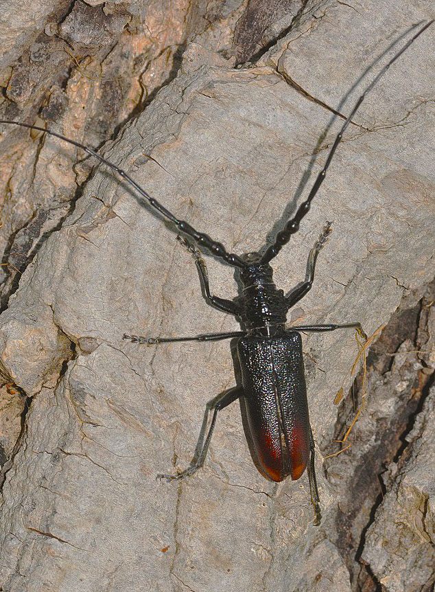 Su questi tronchi si trovano anche altri buprestidi più diffusi quali B. novemmaculata e B. haemorrhoidalis. Con un po’ di fortuna, assai più frequentemente in maggio, si può osservare anche questo portentoso (quasi 40mm) e stupendo elateride, che a volte frequenta i tronchi anneriti dagli incendi dove è quasi invisibile Calais pareyssei, purtroppo visto quest’anno in un esemplare singolo, in parte letteralmente “affondato” con il protorace nella corteccia di un pino, quasi perpendicolare alla stessa.