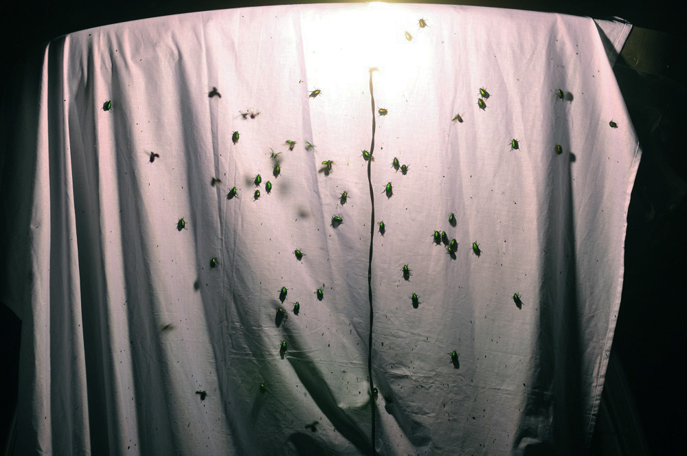 Diciamo che nel corso degli anni, quando la foresta non era ancora area protetta, ho provato ad utilizzare lampade a Luce di Wood da 125 watt e HQL da 125 watt a vapori di mercurio bianche, (con un generatore Honda 350) posizionandomi nelle radure sabbiose, ottenendo alterni risultati. Quest’anno mi sono tenuto più alla larga usando una Osram HQL da 50 W a vapori di mercurio, alimentata con una batteria indipendente da 55 A/h, sopra ad un telo bianco che pendeva dal portellone posteriore della mia macchina, anche per essere più discreto.