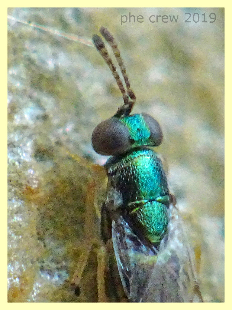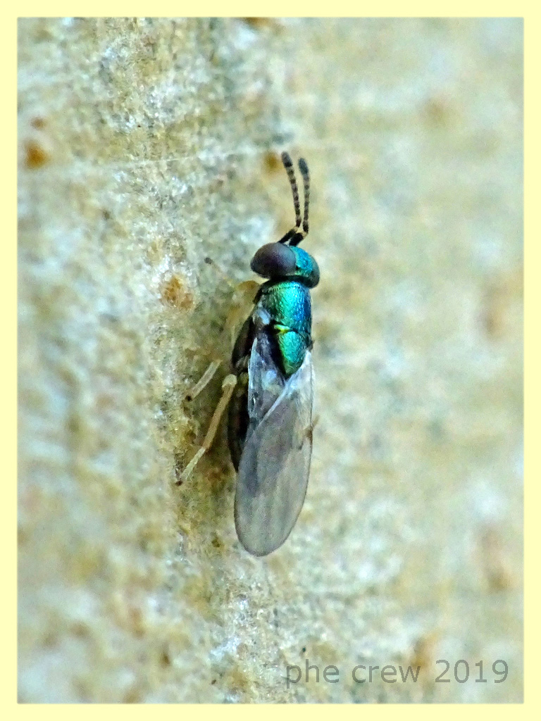 ... questo piccola vespina che dalla punta delle antenne alla punta delle ali misura 2,5 mm., camminava sul tronco di un Eucalipto scortecciato. Inizialmente dalla postura e da come camminava inseguendo un Thaumastocoridae credevo fosse un antagonista di esso, ma poi documentandomi mi accorsi che lo rincorreva solo per usufruire di una sorta di melata. Dunque direi proprio che sia la carnefice delle Psille cioè Psyllaephaghus bliteus.