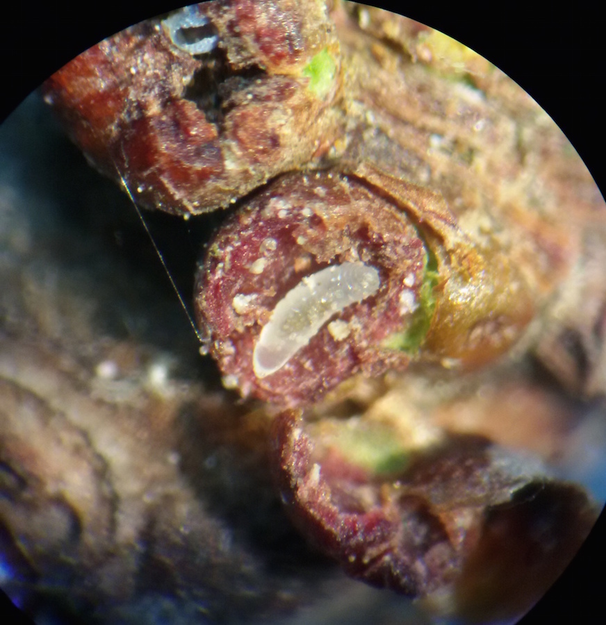 Durante la stesura della tesi di laurea sull'eriofide galligeno del susino (Acalitus phloeocoptes), aprendo e osservando le galle, mi sono trovato più volte di fronte ad un imenottero (prima larva, poi pupa). Allevando le pupe sono riuscito a far sfarfallare l'adulto.