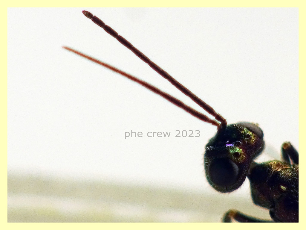 ...questo Imenottero l' ho trovato quasi immobile su di un tronchetto di un arbusto ormai morto, di cui ho dimenticato di fare foto. La cosa che mi ha colpito e' che pur avendo le ali non le usa molto di frequente, ma fa degli zompi a mo di grillo per poi involarsi e subito atterrare su di un altro ramo :o . Anche nel fargli le foto a casa la stessa cosa, lo sfioravo zompava velocissimo con un paio di battiti d' ali e si rifermava come se non fosse successo nulla....senza nemmeno provare a fuggire. Cercando un po in rete, secondo me, dal pronoto sembra essere piu' un Eusandalum sp. che un Calosota sp.....