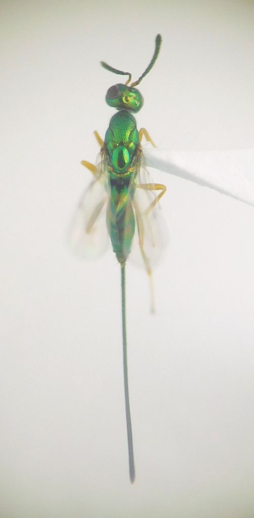 Un Torymidae non lo si identifica, di solito, da una foto; purtuttavia, una specie così verde, snella, e con un ovodepositore lungo 5-7 volte la tibia posteriore, raccolto per di più in pianura o quasi, direi proprio Torymus affinis, parassitoide gregario delle larve di Biorrhiza pallida su Quercus robur (raramente Qercus cerris, Quercus petraea e Quercus pubescens).