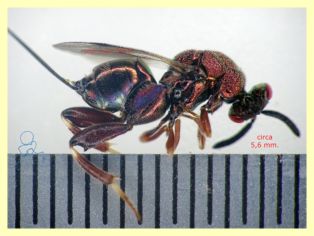 .... :lol: :lol1: :lol: :lol1: :lol: :lol1: .....mi sono fatto ingannare per quei pochi secondi che lo vidi dalle coscie cicciottelle !....non oso immaginare allora le altre specie cosa in realta' fossero :lol: :lol: :lol: ....Questo e' palesemente un Torymus cupreus....un Torymidae ed e' anche abbastanza grosso. Sul forum ci sono due soggetti isolani ....Sicilia e Sardegna, mi chiedo allora se per il "continente" sia la stessa specie o altra affine ?
