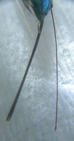 Misura ca. 4 mm e l'ovopositore supera di un poco la lunghezza dell'insetto.