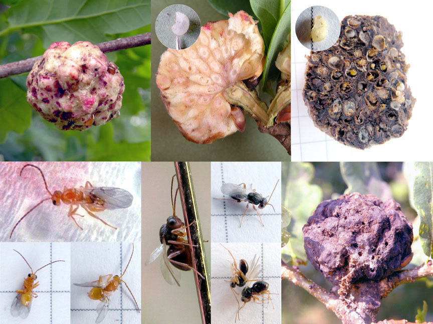 Ho avuto l’occasione di trovare galle di Biorhiza pallida (Olivier, 1791) in forma invasiva su una pianta di Farnia (Quercus robur L.s.l.). La cosa sorprendente è constatare che dalle galle che ho prelevato sono uscite 2 specie di cinipidi (almeno a me sembrano entrambi cinipidi): uno dalla colorazione scura, l’altra rossastra. Inizialmente ho pensato che fossero la stessa specie, poi, confrontando alcuni testi di carattere scientifico, sono giunta alla conclusione che solo uno è il cinipide che ha prodotto queste particolari galle, ovvero quello a colorazione rossastra. E l’altro credo, ma non ne sono sicura, che si tratti di un particolare cinipide, ovvero di Synergus gallaepomiformis (Fonscolombe 1832) inquilino di Biorhiza pallida. Esso non è in grado di produrre galle proprie, pertanto sfrutta quelle di altri suoi simili.
