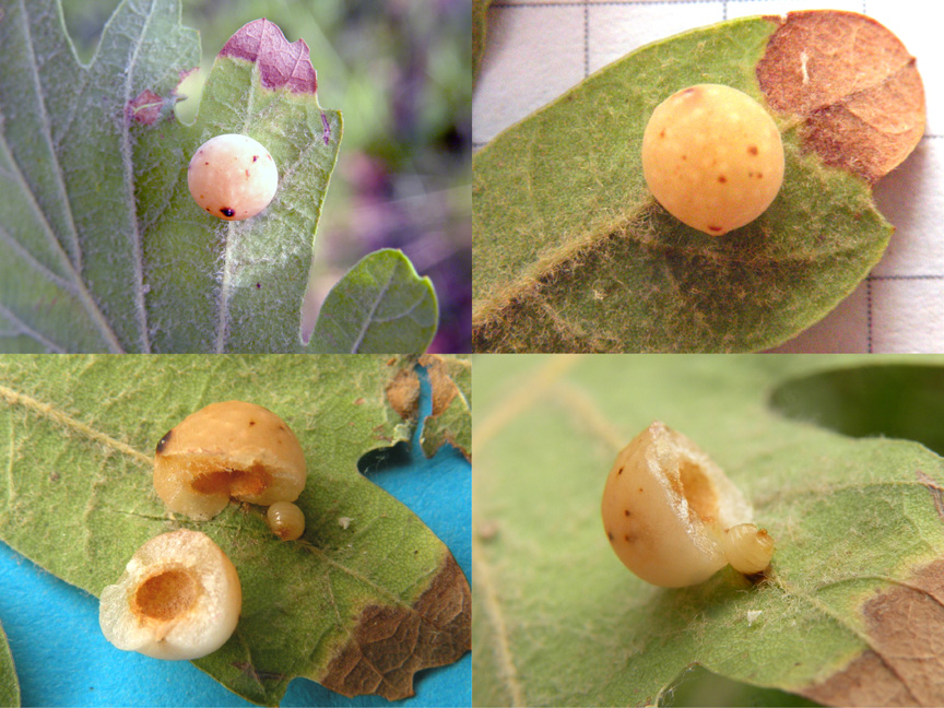 Quanto affermi è documentato dall’autore spagnolo ma che le galle di queste specie (generazione agamica) siano inconfondibili mi pare un poco esagerato! Forse, se non ci fossero nella realtà della natura galle “abortite”, parassitate, o semplicemente sottosviluppate per condizioni ambientali avverse. Se hai modo di allevarle ti consiglierei di ricostruire il più possibile condizioni simili al suolo umido dove la galla supera i mesi invernali. Condizioni più artificiali per la mia esperienza hanno dati risulti negativi al fine di ottenere lo sfarfallamento dell’insetto. Spesso per recuperare il Cynipide ho ricorso al sezionamento del cecidio e nel loculo ho trovato esanime il piccolo imenottero verosimilmente per “carenza di umidita”.