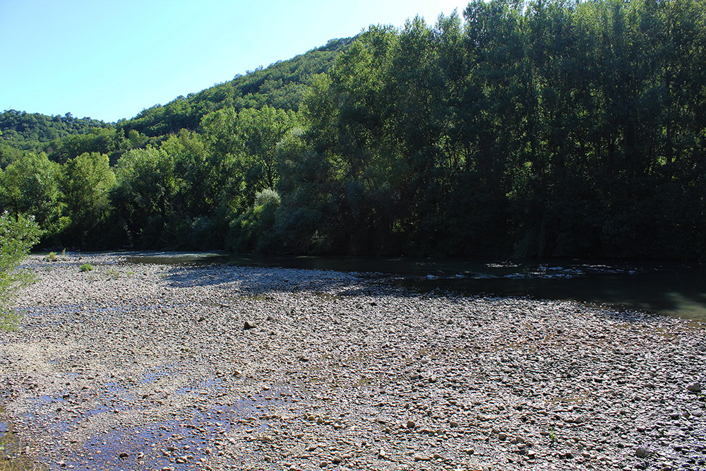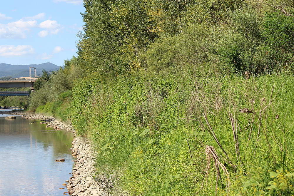 Finalmente mi affaccio sul Tevere! In questo tratto il sentiero è separato dal greto del fiume da un dislivello di circa 4 m, che serve a contenere le imponenti piene che avvengono nel periodo invernale. Con il ridursi delle piogge tra primavera ed estate il livello del fiume cala progressivamente, fino a lasciare scoperto questo spiaggione sassoso, molto amato dai pescatori e meno da me, in quanto veramente povero di fauna alata e pungente.