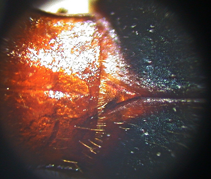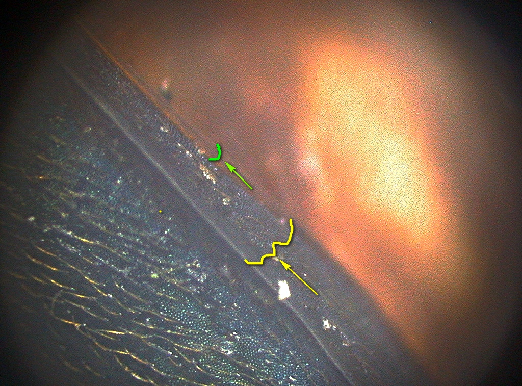 Ho fotografato il margine dell'elitra. Consideravo come epipleura la struttura più larga, evidenziata in giallo... Ma se l'epipleura è quella più stretta (evidenziata in verde), diventa effettivamente rossastra da metà elitra!