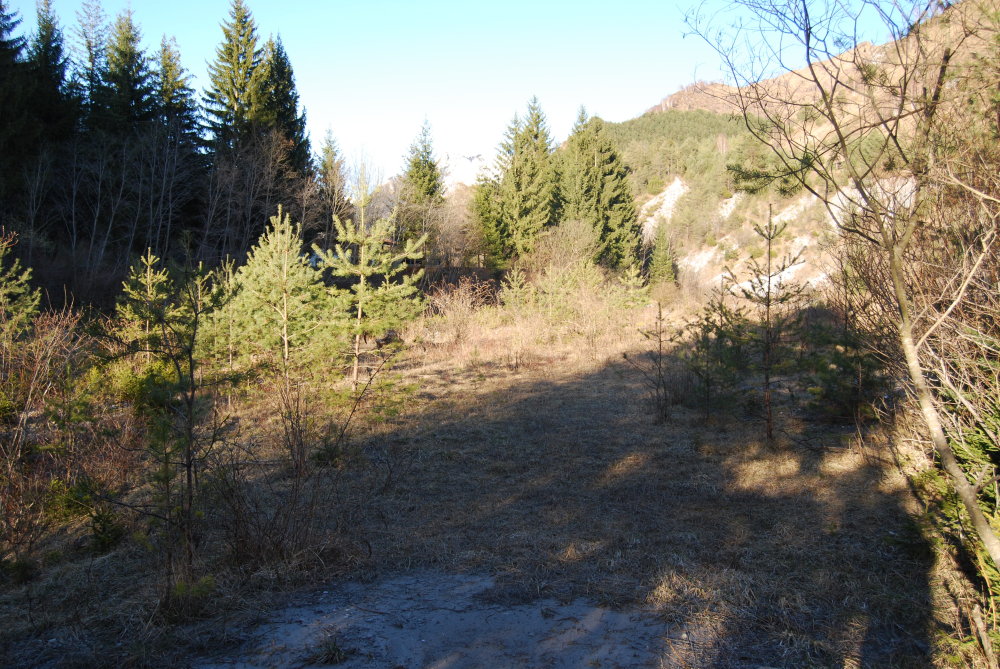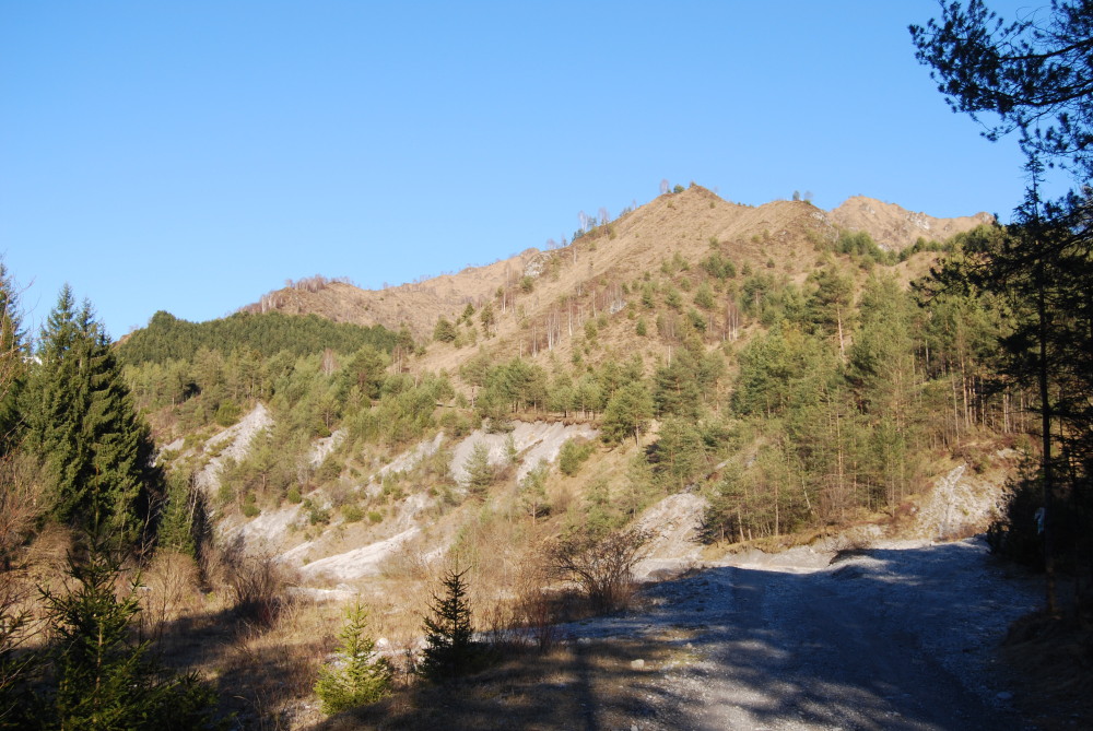 ciao Maurizio, l'acqua c'è solo quando c'è il disgelo o dopo gli acquazzoni, adesso solo un piccolo fiumiciattolo esattamente di fianco a questo aveva l'acqua, ma è arido anche in estate, anzi, di più, soprattuto l'ambiente che mostrerò adesso. è un ambiente infatti, che mi ricorda i calanchi, che si trova nel versante, mi pare, esposto a sud, dove c'è una vegetazione completamente diversa da quella dell'altro versante, che invece non è arido, con pini sparsi e cespugli, ma con un bosco di abeti molto umido e adesso una veduta generale del versante xerico come si vede già dalla veduta generale ci sono molti cespugli e pochi alberi, e spessso i cespuglietti lungo il sentiero formano come delle spondine alcuni pini di diversa grandezza e più o meno secchi, e quindi vulnerabili all'attacco di specie xylophaghe, uno grande uno più piccolo uno completamente secco dopo, si vedeva una montagna davanti alla quale c'era un ambiente umido, e dietro si ritornava a uno xerico il dietro montagna più umido, anche se dalla foto purtroppo non si vede benissimo uno che ho ispezionato trovando nei rametti diverse gallerie di xylophagi, così per il tipo di legno e la grandezza dei rametti ispezionati l'ho soprannominato pino Pogonocherus ma nel versante subito prima della montagna c'erano diversi cespugli di pino mugo, credo, che formavano un mancchia molto particolare