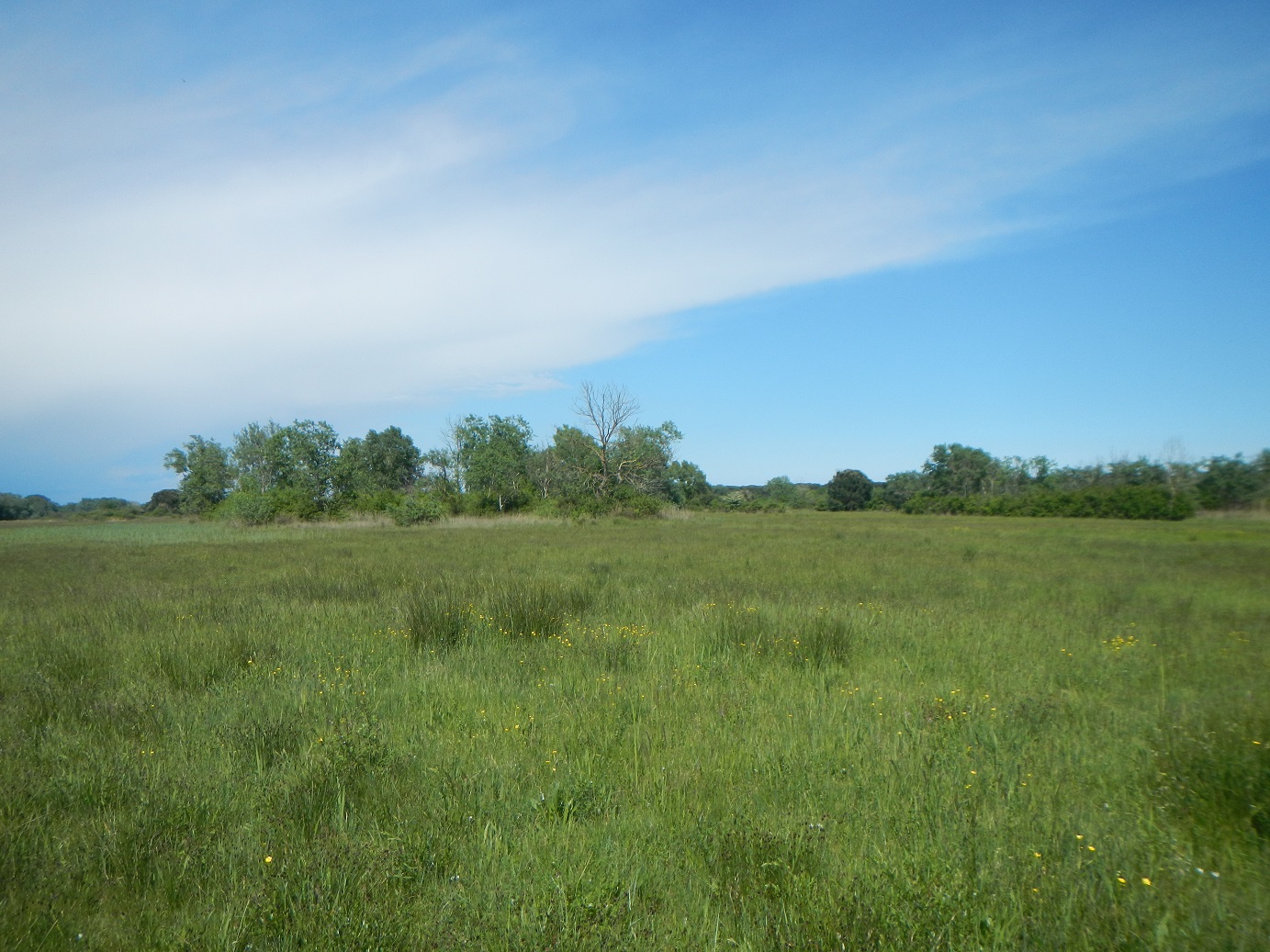 In mezzo al prato ogni tanto vi sono alcune piccole "isolette" di vegetazione, con pioppi, querce, lecci, olmi, salici, eccetera.