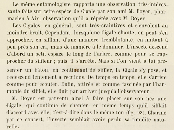 Riapro dopo qualche tempo "l'album di famiglia" per aggiungere un documento utile a sfatare definitivamente il luogo comune che dipinge l'entomologo come un tipo stravagante e un po' folle. Si tratta di un'osservazione molto interessante riportata dall'entomologo francese Antoine Joseph Jean Solier (1792-1851) sugli " Annales de la Societé entomologique de France" e riferita da Louis Figuier (1819-1894) nella sua opera "Les Insectes", pubblicata a Parigi nel 1869. L'esperimento, che riguarda la "cigale plébéienne" ( Lyristes plebejus (Scopoli 1763)) è illustrato nel dettaglio nel testo in francese che accompagna la figura che vi propongo e non vale dunque la pena aggiungere altro