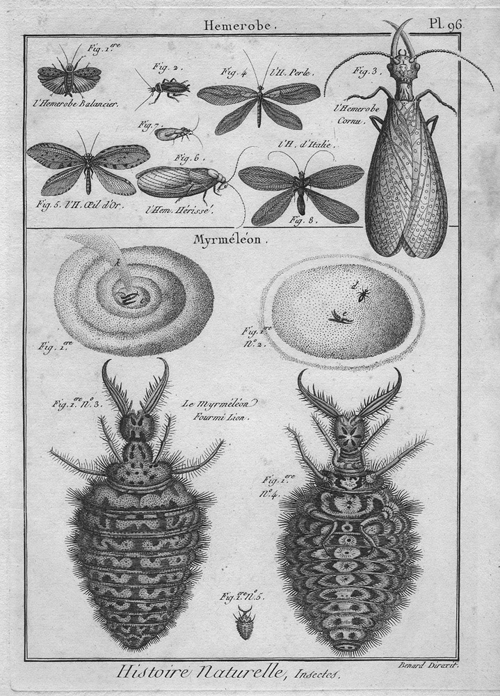 Caro Massimo, così al volo, senza nessun controllo, posso dirti che le prime due tavole appartengono sicuramente ad un'opera diversa dalla terza e, di più, sono composte con figure provenienti da altri lavori. Identifico a memoria l'H.[emerobe] d'Italie come la figura dell'Hemerobius italicus di Rossi (la tavola originale c'è anche sul forum) e la grande larva di Mirmeleontide dovrebbe essere di Rosel. Comunque una sera, con calma, ti trovo tutto (oppure se c'è qualcuno che vuole divertirsi). Ciao Roberto