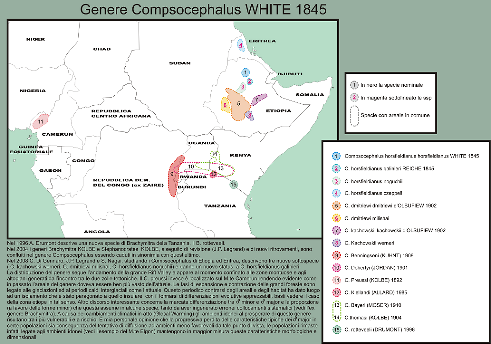 Per alcuni areali le informazioni sono piuttosto generiche, in altri casi invece abbastanza dettagliate (vedi Compsocephalus in Etiopia-Eritrea). Anche per quello che riguarda alcuni dettagli anatomici si passa da un outline molto semplificato (vedi Allard) ad altri molto più realistici dove la base di partenza è una foto di buona qualità dell'insetto o una buona tavola illustrata.