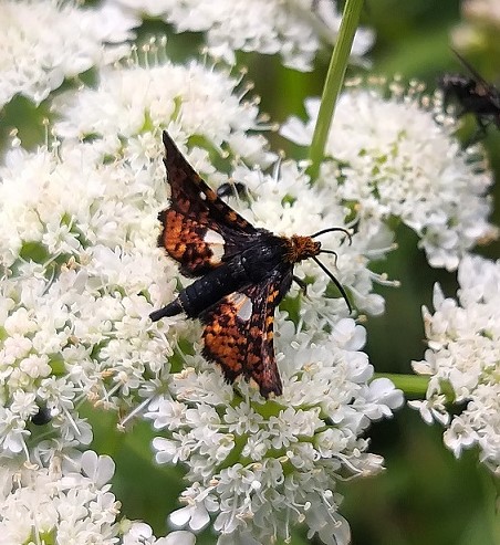 Inconfondibile e caratteristica: Thyris fenestrella (Scopoli, 1763), Thyrididae (parente dei Pyralidae/Crambidae, pare). :hi: