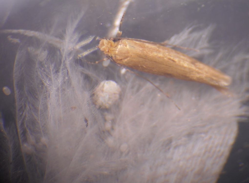 Nel giugno del 2020 ero a Gioia del Colle (BA), nel corso di un sopralluogo in zona SIC (Murgia alta), circa 6 km a sud del centro abitato, in una zona di seminativi con macchia mediterranea e boschi. In un seminativo ho raccolto una piuma e una penna; due giorni dopo, guardando la penna al binoculare, ho notato dei minuscoli bruchi, meno di tre mm. Li ho messi in un barattolino e, man mano che crescevano inserivo parti di penne. L’anno successivo sono sfarfallati gli adulti e ad oggi proseguono le generazioni annuali. Il nutrimento che procuro loro è dato solo da parti di penne di piccione, e a inizio ciclo parti di piume. Appena sgusciati dall’uovo, o poco dopo, i bruchetti si costruiscono un astuccio sericeo che ricoprono di escrementi e, forse, parti di penne (anche perché non c’è altro …). A maturità gli astucci misurano circa 7 mm, gli adulti 5,5-6 mm Da fine settembre sta sfarfallando la nuova generazione, e finalmente trovo il tempo di inviare alcune foto e chiedere agli amici del forum: che farfalla è? Mi piacerebbe anche qualche informazione sulla biologia della specie. La prima foto è di due adulti ed un astuccio Seguono foto dell’astuccio, di adulti, e di un adulto e alcune uova. |